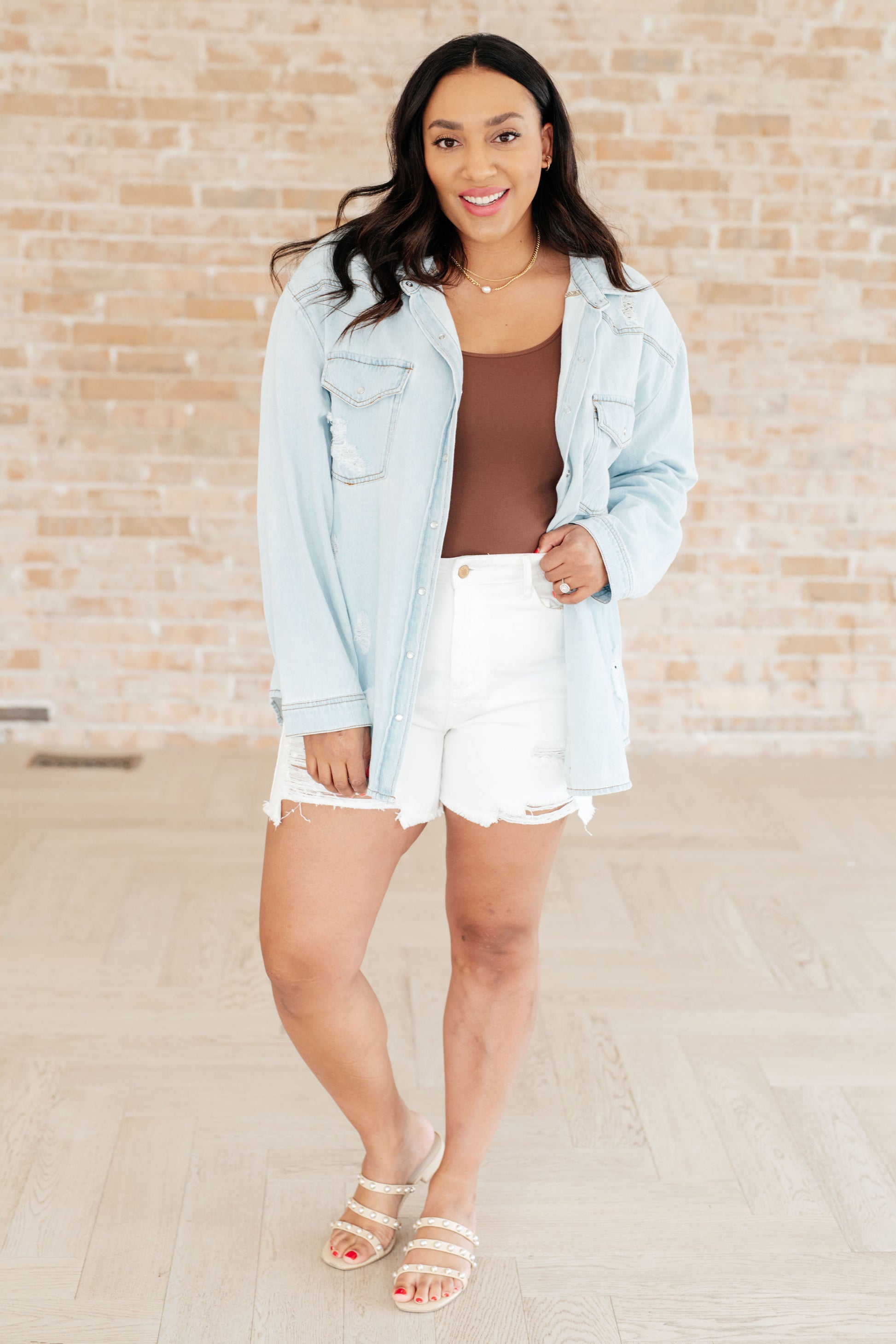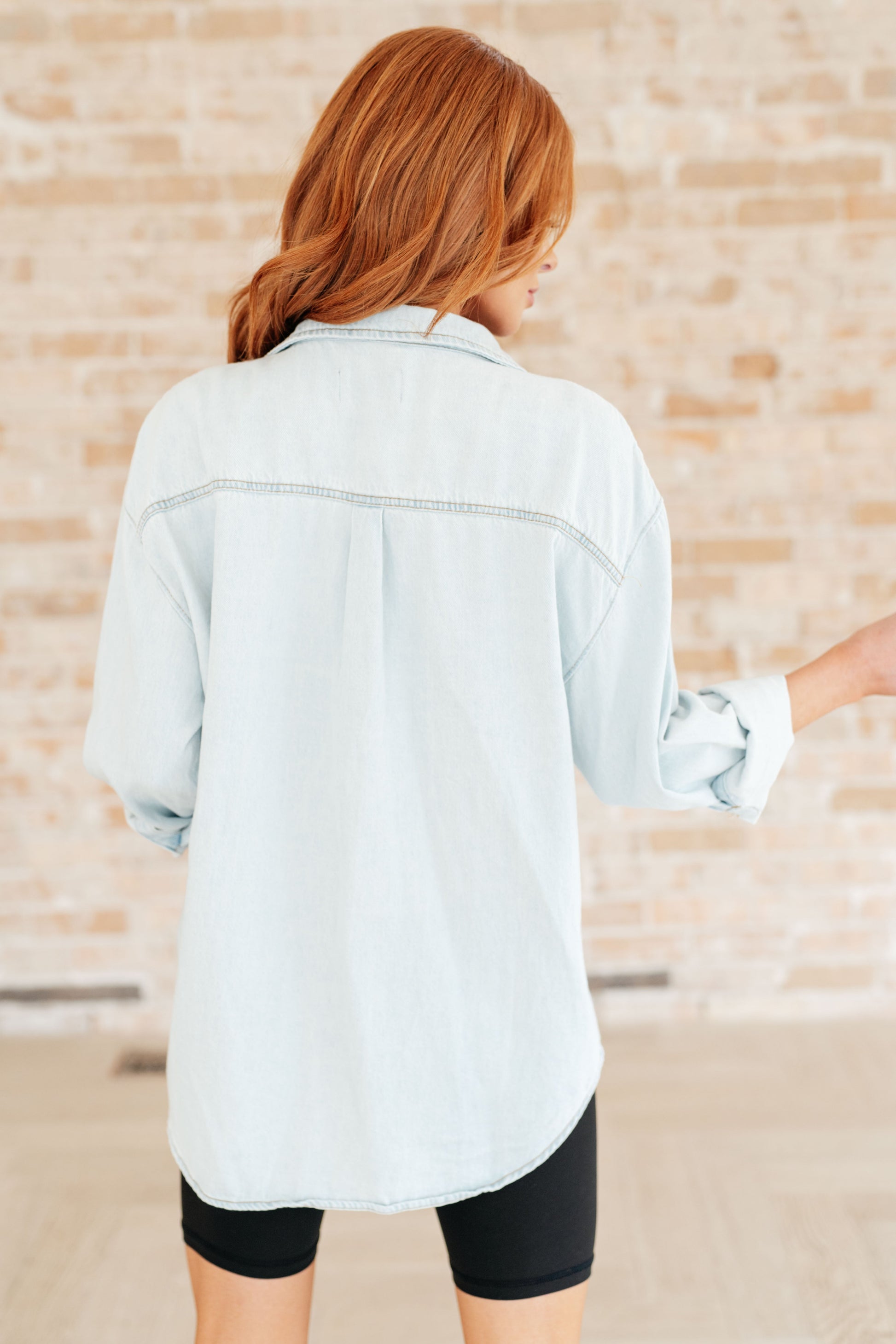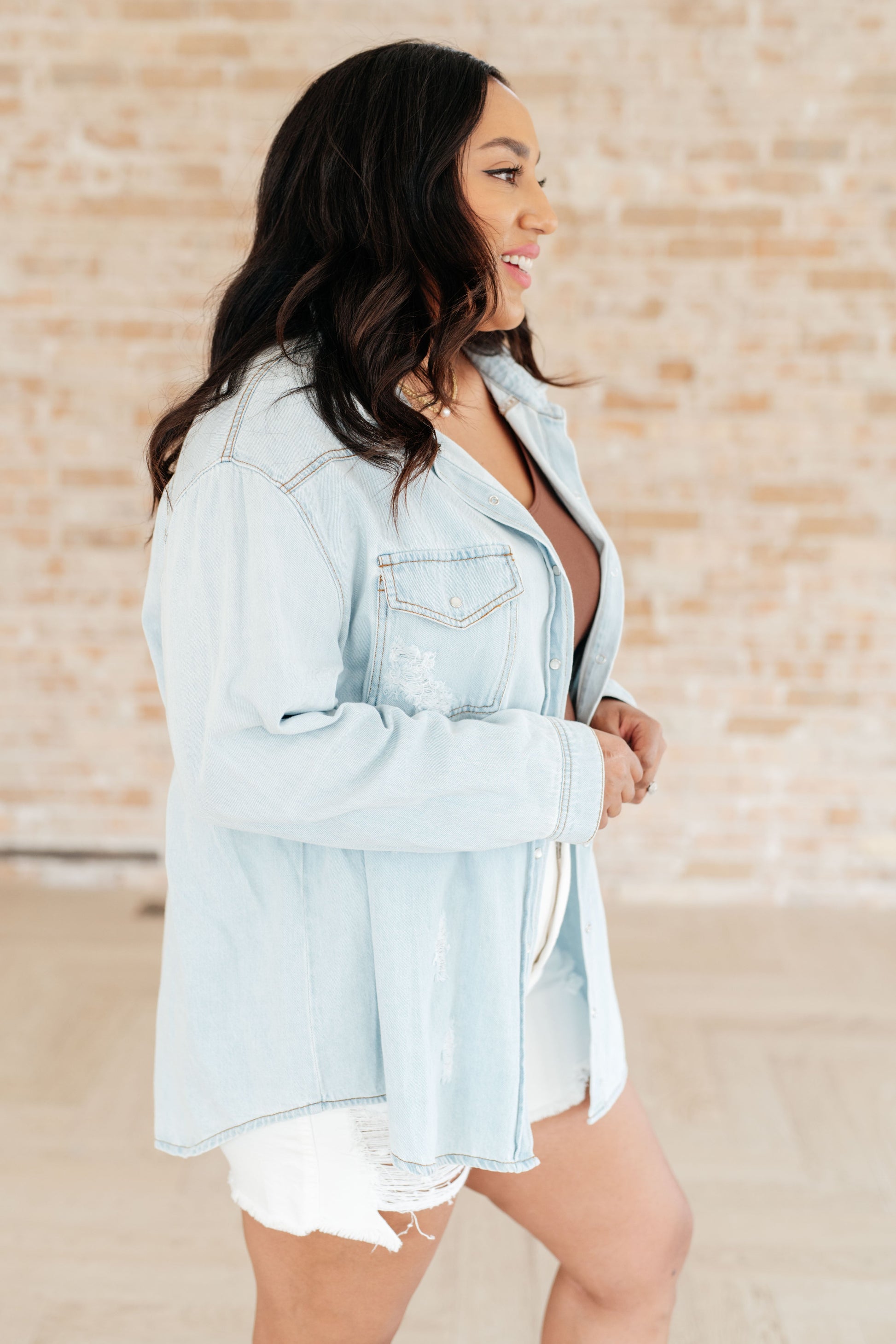 You hear that? That's the "oohs" and "ahhs" from My Walkman Denim Shacket. Crafted with lightweight denim and featuring a collared neckline, this shacket adds a touch of edge to any outfit. The faux pearl snap closures, front patch pockets, and distressed detailing add unique touches, while the banded sleeve cuffs and scooped hem provide a comfortable and flattering fit. Upgrade your wardrobe with this versatile and stylish piece.