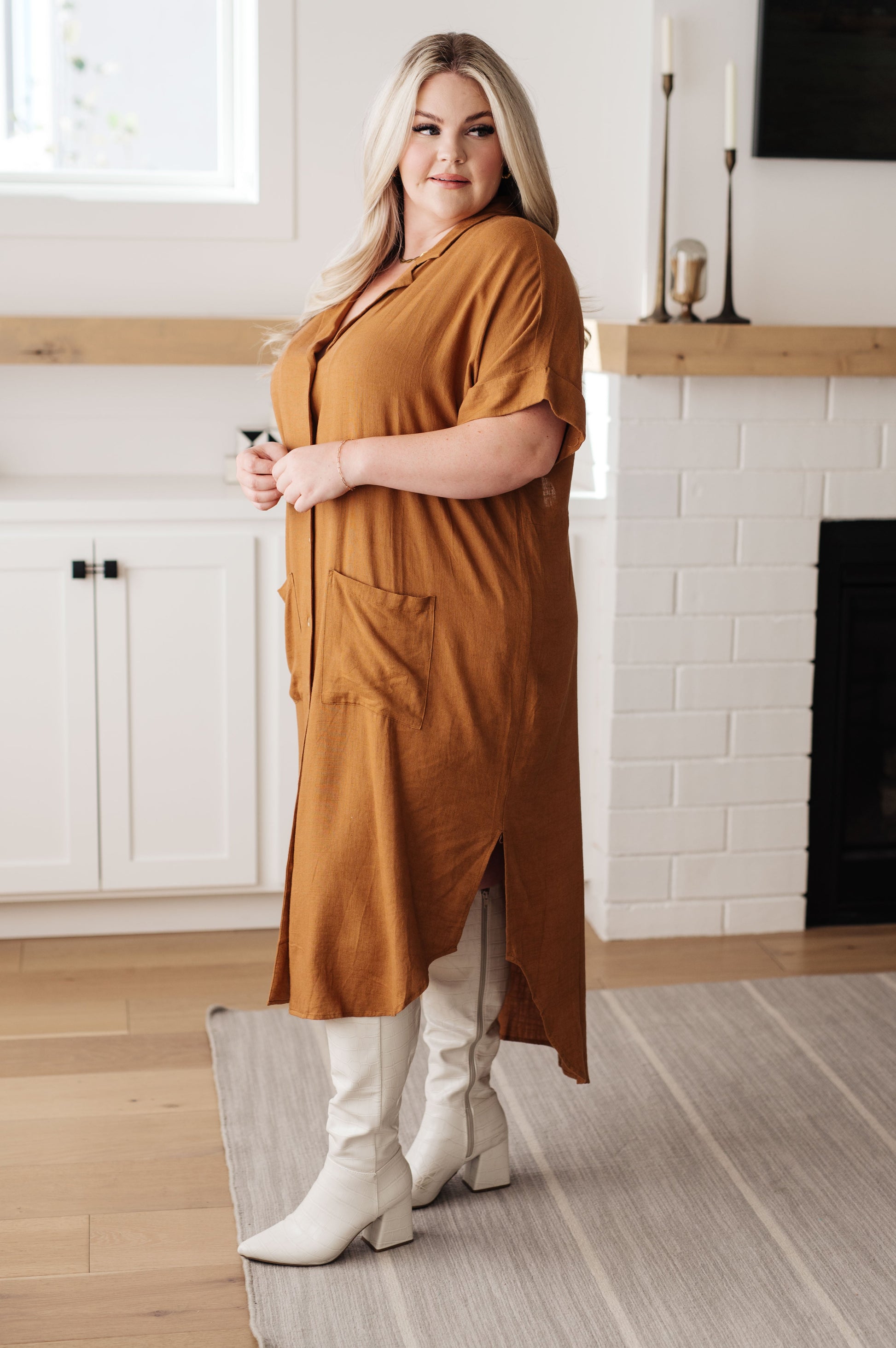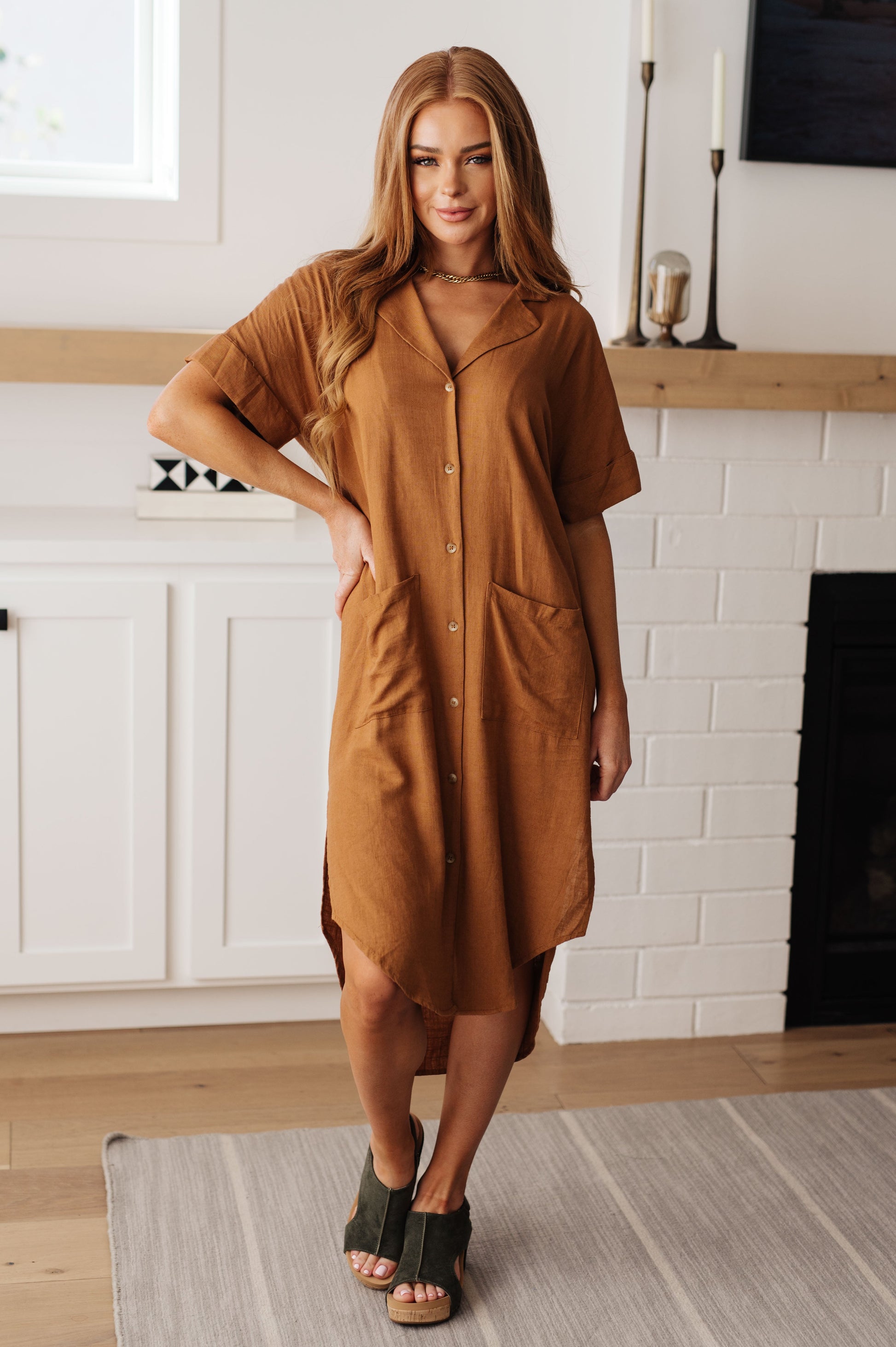 This Sure to Be Great Shirt Dress is the epitome of chic! Its linen blend and collared neckline create a timeless look, while the twisted cutout back waist detail adds a modern twist. Button front closure, cuffed sleeves, patch pockets, and midi length make this dress functional as well as stylish. It will be a surefire favorite in your wardrobe!
